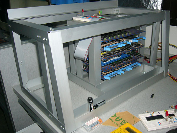 Plans on the enclosure started after the machine worked. At this stage I have already attained confidence on the machine operability. The enclosure frame was made from the same material as the card cage but it will be covered with acrylic. Some pictures of the construction..![]() ![]() ![]() Base of enclosure after assembly ![]() ![]() The card cage fitted inside the enclosure ![]() ![]() LED assembly for the front panel ![]() ![]() The case finished but not yet finalized |
