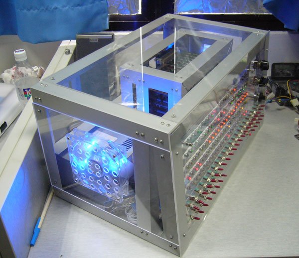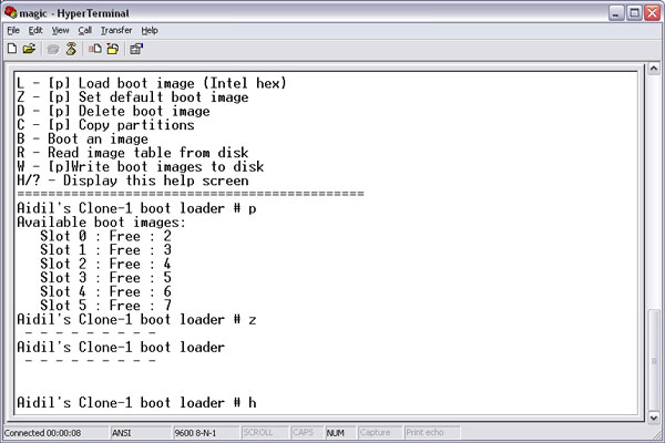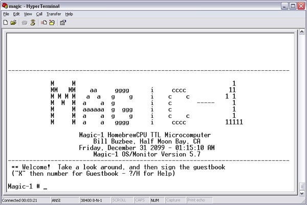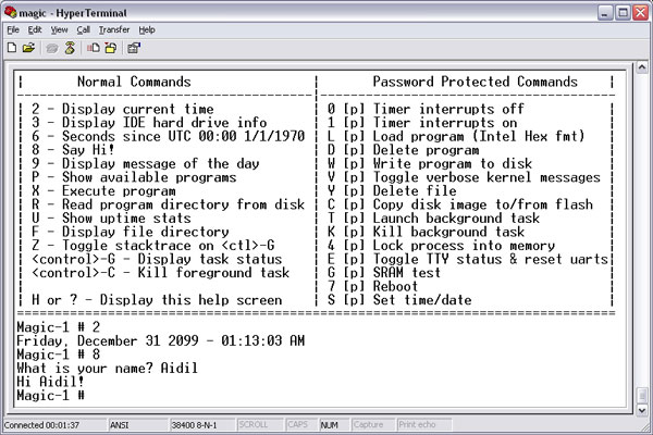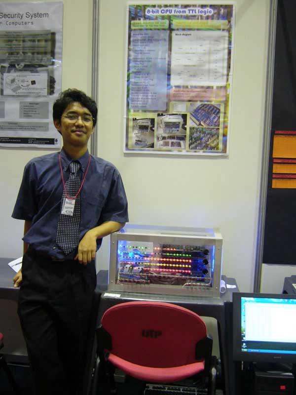 For the moment, the clone passed all the tests listed in the machine validation suite. And I was able to get the serial communication to work. Here's a screenshot of the machine booting.![]() Also, I was able to retarget LCC for Magic-1 meaning that I can compile my own program to use on the clone. But for now, programs can only be burnt onto the boot PROM because the IDE controller isn't working. I am working on the IDE controller so that we can load the operating system in the future. I am very satisfied with the progress of the clone at the moment. But I could not be where I am now without Bill Buzbee's help. Thank you very much Bill! ![]() The clone finalized (click the picture for the full resolution version). ![]() ![]() Closeup at the edge connector (click to enlarge). Picture below shows us (me and Aaron) with our supervisor Dr Yap in the center. He is the man who encouraged us to undertake these projects and had been very supportive throughout. The machine that Aaron built (Mark I FORTH Computer) is on top of Magic-1 clone. Click here to read about Aaron's machine ![]() The clone recently made it into EDX (engineering design exhibition) held here every semester. Here's a picture of me with the machine at the exhibition. ![]() ################################################################## Update (Jan 30, 2008) These pictures should've been put up way earlier, I'm two years late. Actually, the operating system was successfully loaded before leaving school. But then the hard disk interface hasn't worked so the OS was downloaded through the serial to the SRAM everytime on startup. This process will take approximately 30 mins if I remember correctly - but Dr. Yap was able to do it faster somehow. Along with that, eliza (the program) and banner ran too. Ok, time for some pictures.. ![]() ![]() Also, in mid 2007, Bill again sent in some parts to help Magic-1 development. They were a proper 8500 chip, preloaded kitty hawk hard disk and a new bootloader. Everything works then with a new version of OS. Pity I don't have any pictures on that.. Link to the original machine (Magic-1) : www.homebrewcpu.com Magic-1 was cloned by: Aidil Jazmi  aidilj@gmail.com |